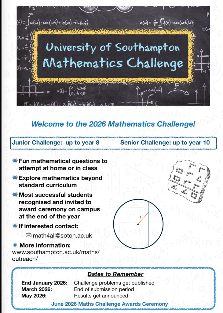 It always makes me happy to see opportunities for students to experience that same kind of thinking. The School of Mathematical Sciences at Southampton is currently running its Maths Challenge, encouraging exactly this sort of curiosity and persistence.