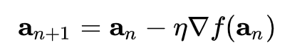 This funny notation above represents the step in gradient or how big of a step we decide to take in the ‘uphill’ direction, i.e. the steepest way things increase from where you are, and we add the minus sign so that we go the opposite way. Too big of a step, and we might overshoot. Too small, and it’ll take forever.